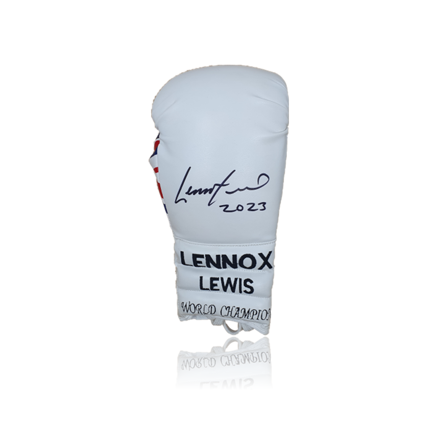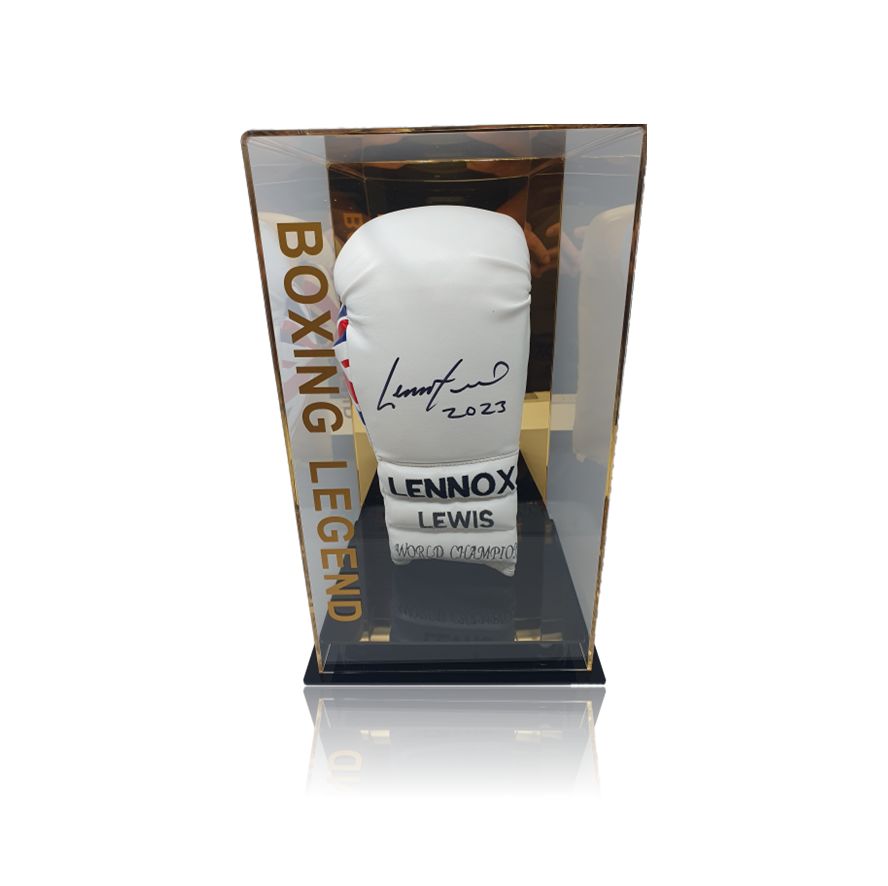Lennox Lewis Signed WHITE Boxing Glove In Acrylic Display Case. The Glove Features a very clear signature which is located on the centre front of the Glove. The Glove was personally hand-signed by Lennox at a Private Signings conducted by one of AAA Sports Memorabilia’s most trusted partners. This item is Very Rare and Comes with Full Certificate of Authenticity & Photo Proof.